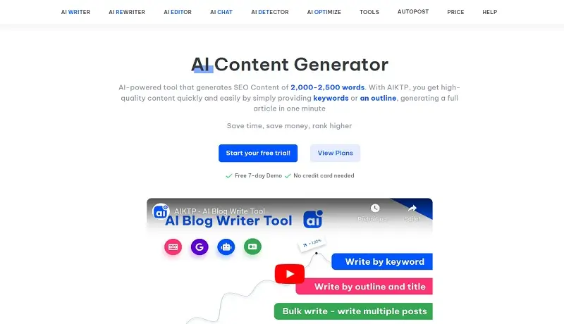 AIKTP je pokročilý asistent pro psaní s umělou inteligencí určený pro webmastery, copywritery a SEO profesionály. Využívá umělou inteligenci k rychlému generování vysoce kvalitních článků vhodných pro SEO v rozsahu 2 000 až 2 500 slov na základě zadaných klíčových slov nebo osnov. Platforma nabízí sadu nástrojů pro tvorbu obsahu včetně psaní na základě klíčových slov, hromadného generování článků, psaní zpráv, parafrázování a dalších. Cílem AIKTP je šetřit čas a peníze tvůrcům obsahu a zároveň vytvářet poutavé články optimalizované pro vyhledávače.