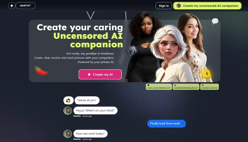 Nastia AI je necenzurovaná platforma společníka určená pro uživatele, kteří hledají autentické, personalizované interakce s chatboty, kteří poskytují emocionální podporu a volnou konverzaci. Je vybavena pokročilými funkcemi generování obrázků pro vlastní obličeje a pózy.