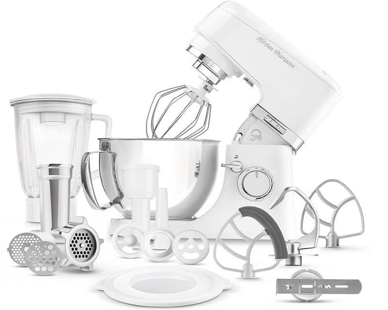 Balení obsahuje základní nerezovou mísu, která má objem 4,5 litru a skleněný mixér na smoothie, omáčky nebo polévky. Součástí balení je i hnětací hák, mísící a šlehací metle, mlýnek včetně nástavce na plnění uzenářských produktů. Nechybí ani nástavec se struhadly nebo plastová násypka, pěchovadlo a průhledný kryt na mísící mísu.
