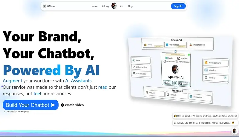 Splutter AI je platforma, která umožňuje libovolné osobě nebo společnosti bez požadavku na rozsáhlé znalosti kódování vytvořit vlastního chatbota řízeného umělou inteligencí. Při komunikaci se zákazníky Splutter AI mění pravidla hry díky svému modulárnímu designu, který uživatelům umožňuje sloučit jejich informace, značku a nástroje a přijít s interaktivním chatbotem na míru.