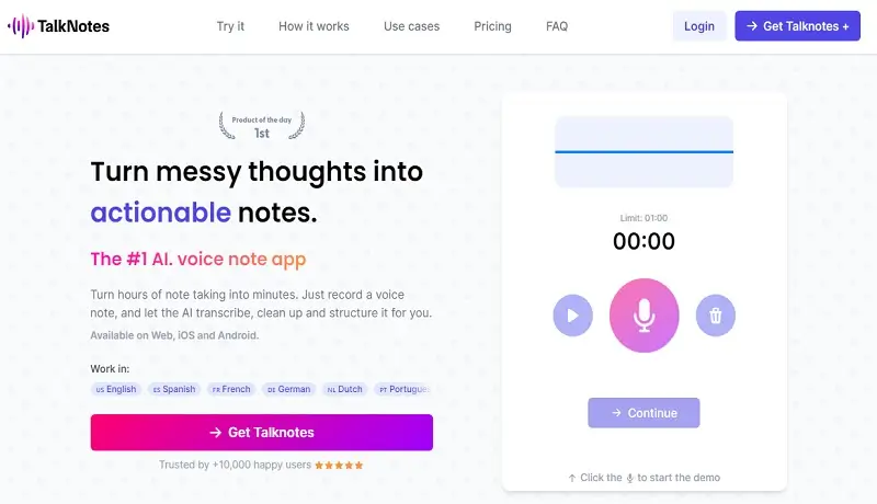 TalkNotes je aplikace pro hlasové poznámky poháněná umělou inteligencí, která je navržena tak, aby během několika minut proměnila vaše myšlenky v dobře strukturované a použitelné poznámky. Tento nástroj pro transkripci s umělou inteligencí je ideální pro každého, kdo chce zachytit nápady, přepisovat rozhovory nebo vytvářet obsah, aniž by se musel obtěžovat nekonečným psaním.