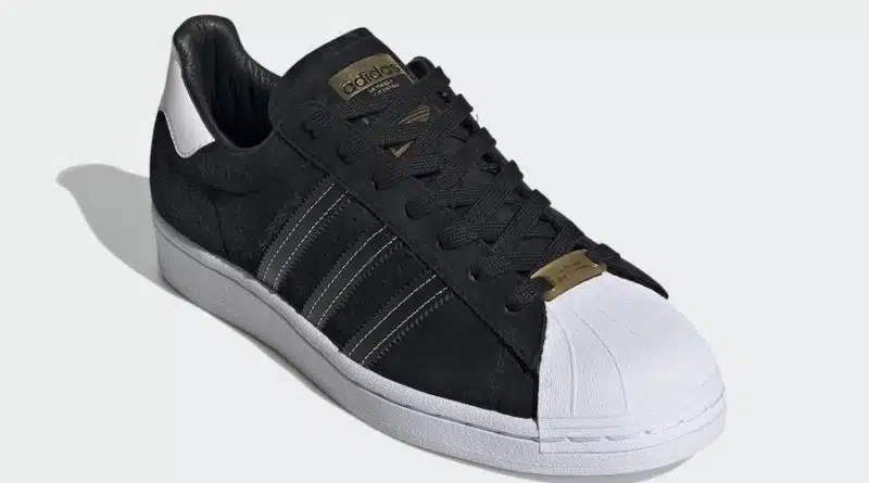 Svršek obuvi je semišový v černé barvě, kterou doplní v bílé barvě kožený překryv na patě a hlavně špička, která je v designu skořápky. Brandové tři pruhy adidas na obou bocích jsou v černé kůži, kterou zvýrazní prošití v bílé barvě. Ve zlaté barvě je prvek na šněrování a štítek s brandem na černém jazyku. Samozřejmě nemůže chybět na vnějším boku brandový nápis Superstar.