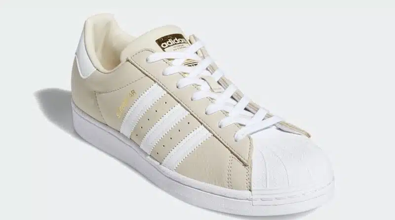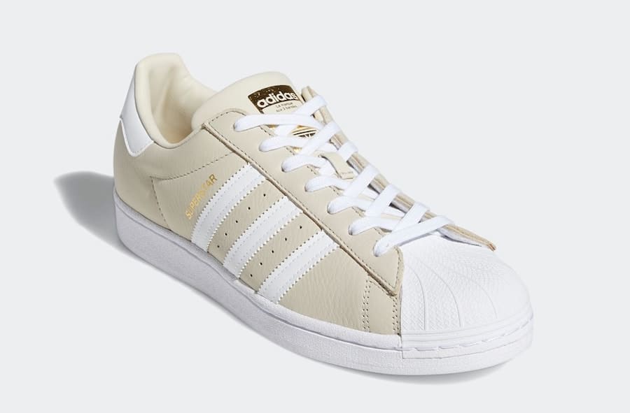 Svršek obuvi je z pravé kůže v béžové barvě s různými překryvy ve stejné barvě, včetně polstrovaného jazyka a vnitřní části boty. Klasická špička obuvi v bílé barvě je v designovém motivu skořápky. V bílé barvě jsou tři brandové pruhy na obou bocích z hladké kůže. Zpevnění paty je v bílé barvě, na kterém je logo adidas ve zlaté barvě. Brandový nápis Superstar na boku je ve zlaté barvě.