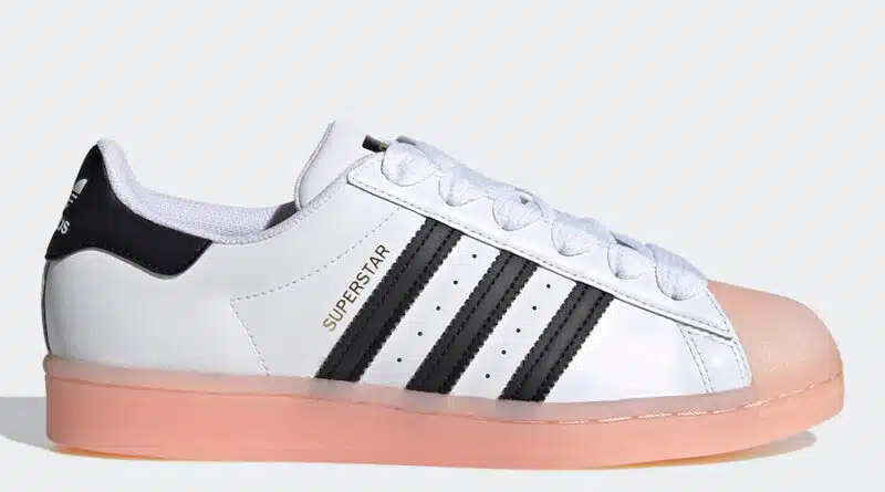 Pohodlná a prošitá gumová podrážka tenisek adidas Superstar Haze Coral je celá ve světle korálové barvě. Oblíbené nízké tenisky budou k dispozici u vybraných prodejců začátkem června.