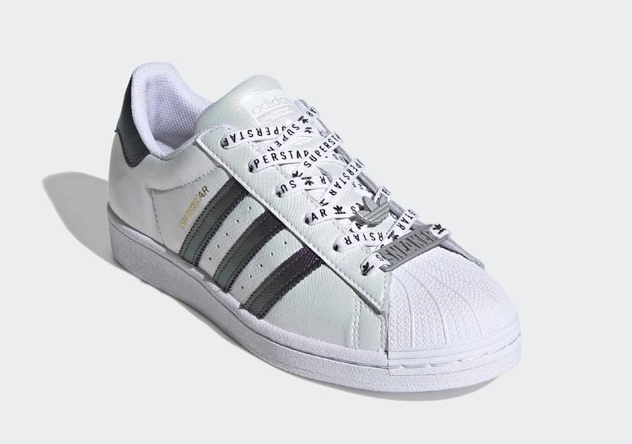 Pohodlná a prošitá gumová podrážka tenisek adidas Superstar Iridescent Three Stripes je kompletně v bílé barvě. Zajímavosti jsou bílé tkaničky, na kterých jsou nápisy Superstar.