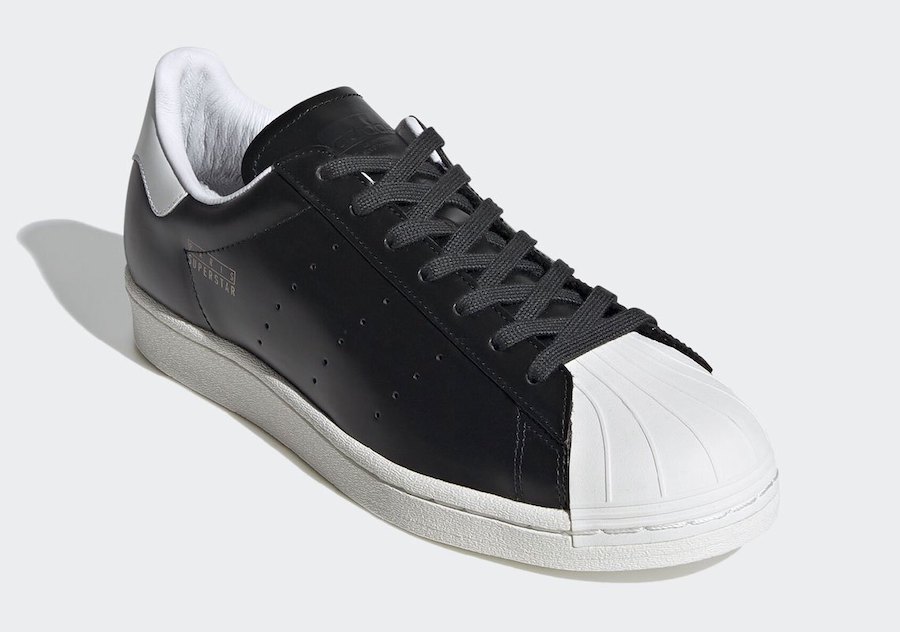 Svršek obuvi je z hladké kůže v černé barvě s různými překryvy ve stejné barvě. Velký jazyk, tkaničky a stélka boty jsou v černé barvě. Klasická špička obuvi je v bílé barvě a v designovém motivu skořápky. Tři brandové pruhy na vnějším boku jsou v designu perforovaných otvorů. Logo adidas na bílém překryvu na patě je ve zlaté a brandový nápis „Paris Superstar“ je v bílé barvě.