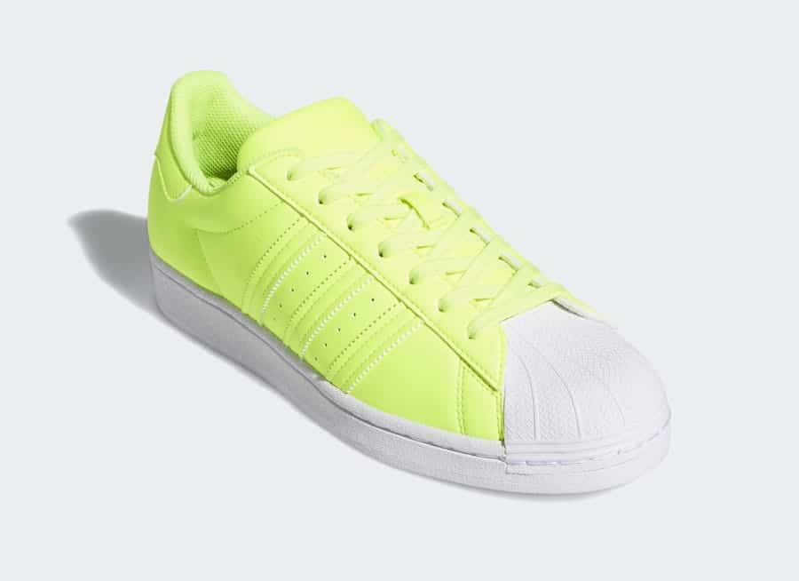 Pohodlná a prošitá gumová podrážka tenisek adidas Superstar Solar Yellow je kompletně v bílé barvě. Oblíbené nízké tenisky budou k dispozici u vybraných prodejců v polovině května.