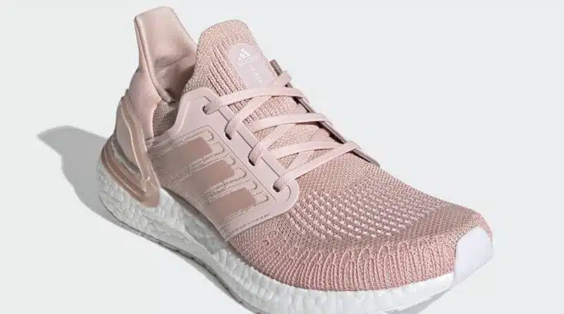 Pohodlná gumová podrážka Boost je v bílé barvě a zespodu je podešev v barvě bílé. Nízké tenisky adidas Ultra Boost 2020 Vapour Pink budou k dispozici u vybraných prodejců během července.