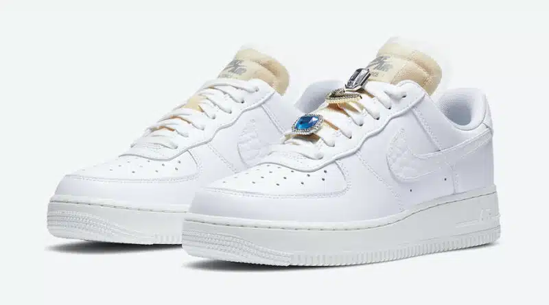 Kompletně celé nízké tenisky s perforovanou špičkou jsou z kůže, která je v bílé barvě. Překryvy kolem špičky a kolem paty jsou v bílé barvě. Velký Swoosh na obou bocích je v bílé barvě. Polstrovaný jazyk je v béžové barvě. Tkaničky a vnitřní část boty jsou v bílé barvě. Zajímavé jsou šperky umístěné na tkaničkách. Kožený překryv na patě s brandem je v bílé barvě. Brand na jazyku je v černé barvě.