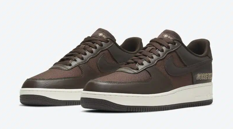 Pohodlná gumová podrážka Air s prošitím je v bílé barvě a podešev je v hnědé barvě. Sportovní tenisky Nike Air Force 1 Gore-Tex Baroque Brown budou k dispozici u vybraných prodejců během srpna.