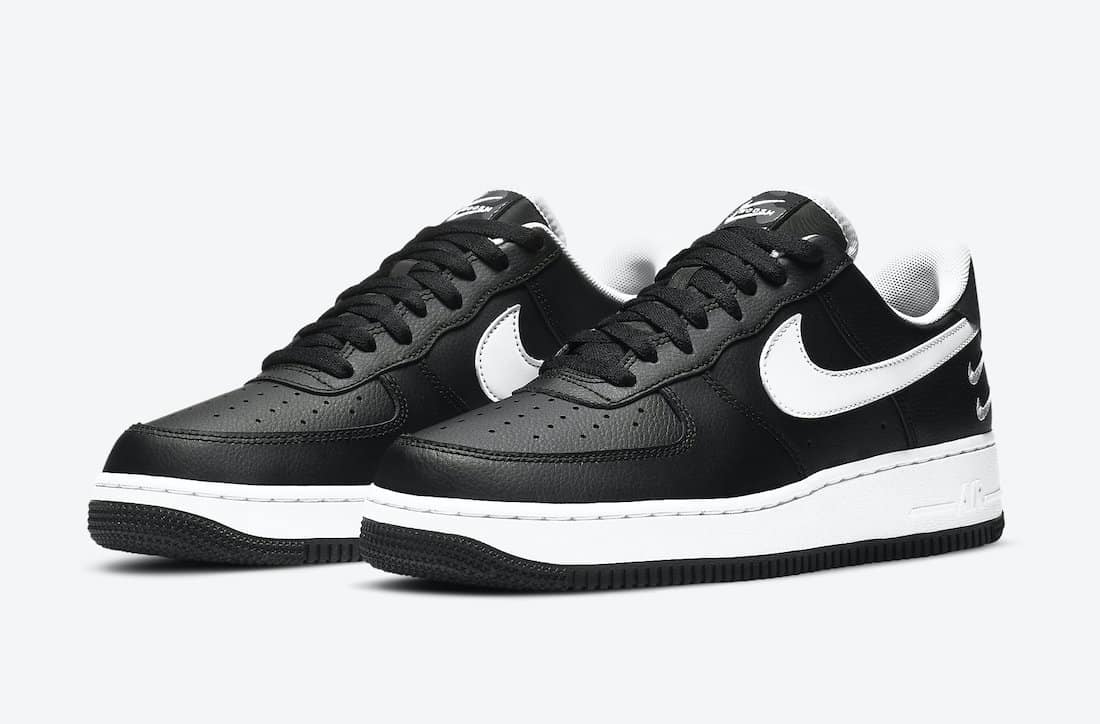 Pohodlná gumová podrážka Air s prošitím je v bílé a pryžová podešev s vysokou přilnavostí je v černé barvě. Kožené černé boty vhodné ke každému outfitu Nike Air Force 1 Low Black White Double Mini Swooshes budou k dispozici u vybraných prodejců během října.