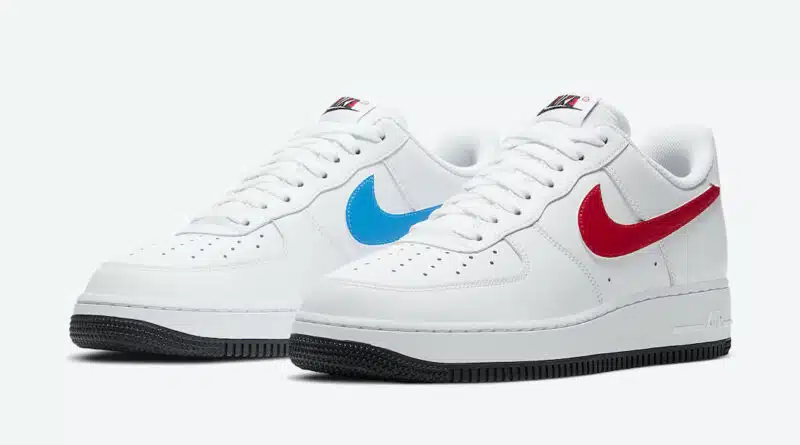 Pohodlná gumová podrážka Air s prošitím je v bílé barvě a podešev je v černé barvě. Sportovní tenisky Nike Air Force 1 Red Blue Swoosh budou k dispozici u vybraných prodejců během srpna.