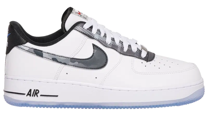 Kompletně celý svršek obuvi je z hladké kůže, která je v bílé barvě. Kožené překryvy kolem špičky a kolem paty jsou v bílé barvě. Velký Swoosh na obou bocích je v šedé a stříbrné barvě v kamuflážním designu. Polstrovaný jazyk a tkaničky jsou v bílé barvě. Překryv na patě je v černé barvě, na kterém je brand v modré a bílé barvě. Brand na jazyku je v bílé a červené barvě.