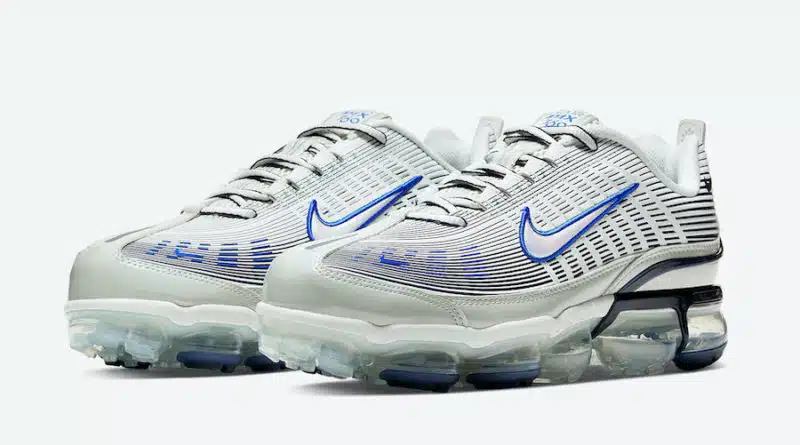Svršek obuvi je kompletně ve světlé pistáciové barvě, kterou zvýrazní designové prvky v královský modré a tmavě modré barvě. V této modré jsou prvky na špici obuvi, brandový nápis VaporMax 360 na polstrovaném jazyku, a hlavně velký Swoosh na obou bocích. Dalším zvýrazněním je lemování šňůrek v tmavě modré barvě, která je zároveň použita na bocích a kolem paty.