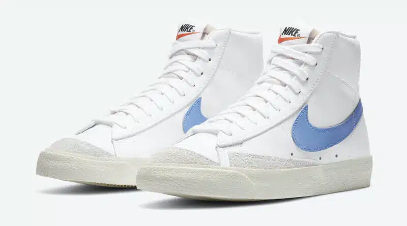 Pohodlná podrážka je kompletně celá v bílé barvě. Celokožené kotníkové boty v bílé barvě Nike Blazer Mid ’77 White Royal Pulse budou k dispozici u vybraných prodejců během září.