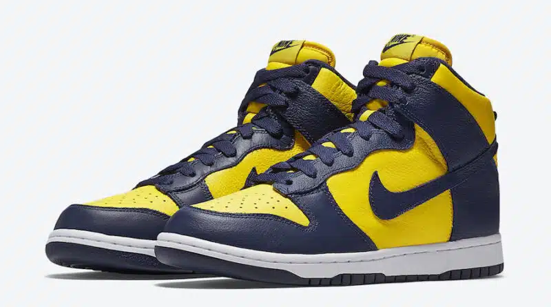 Nike Sportswear připravila další skvělou kolekci oblíbeného retro modelu Nike Dunk High, který je v designovém tématu „Michigan“. Nová kolekce kotníkových tenisek je v moderní colorway bílé, tmavě modré a žluté barvy.
