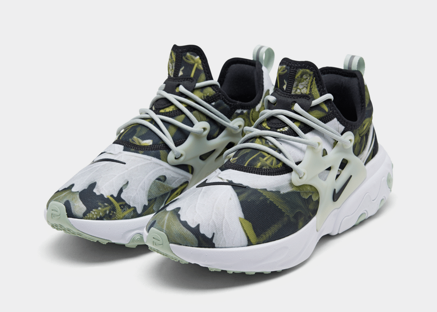 Svršek tenisek je v lesním motivu sestávajícím ze zelených a bílých listů, které jsou po celé obuvi i na jazyku. Tento lesní design tenisek React Presto je kombinovaný s černými detaily umístěnými po celé obuvi. Na bocích jsou umístěny plastové bílé prvky včetně černého loga, které slouží k upevnění obuvi pomocí šňůrek.