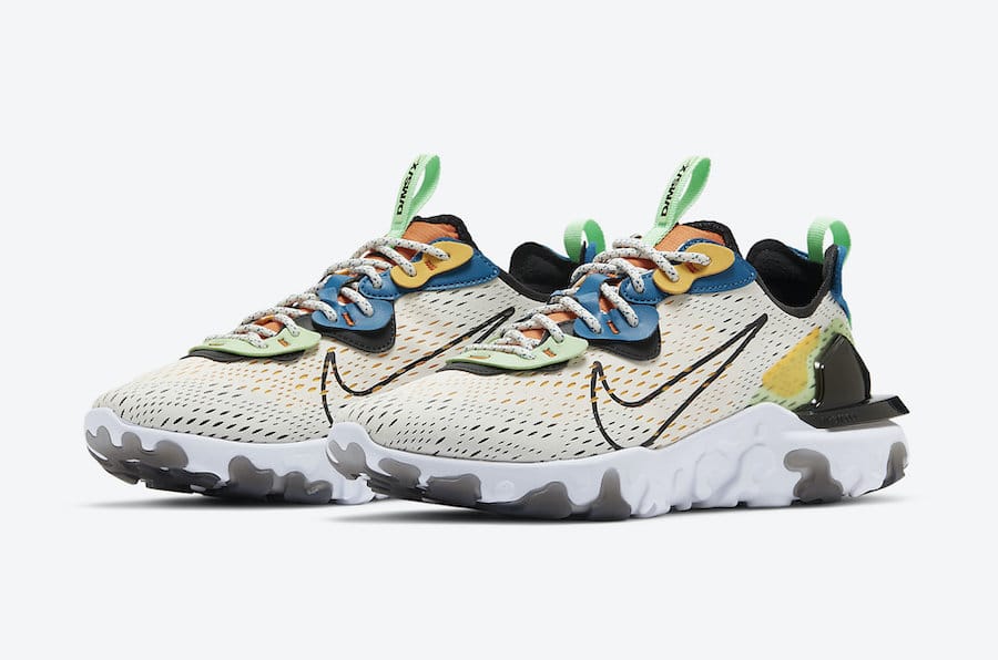 Je připravena další zbrusu nová colorway zavedené řady Nike React Vision, která bude vydána v designovém tématu „Green Abyss“. Nová kolekce bude v zajímavé barevné kombinaci světlých barev bílé, krémové, černé, šedé, modré, zelené, žluté a červené. Design obuvi je součástí nové řady Nike D/MS/X.