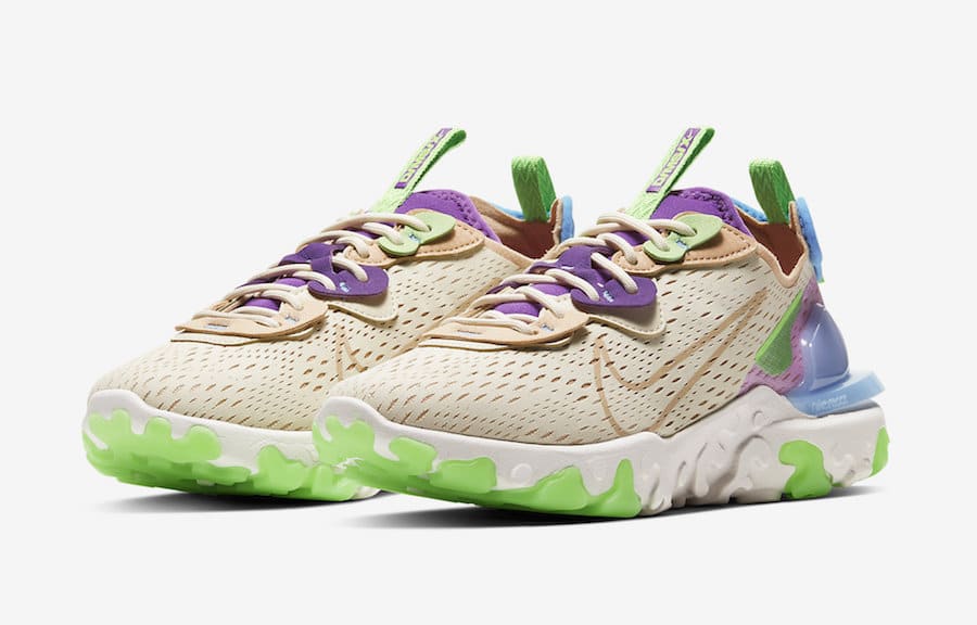 Je připravena další zbrusu nová colorway zavedené řady Nike React Vision, která bude vydána v designovém tématu „Purple Green“. Nová kolekce bude v zajímavé barevné kombinaci výrazných barev bílé, béžové, zelené, fialové a modré. Design obuvi je součástí nové řady Nike D/MS/X.