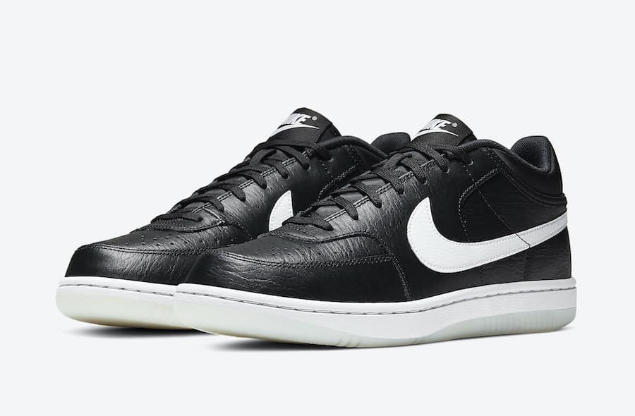 Svršek obuvi je kompletně celý z hladké kůže v černé barvě s perforovanou špičkou, který doplní různě tvarované překryvy. Kožené lemování kolem špičky, kolem paty a překryvy na bocích s přesahem kolem šněrování jsou v černé barvě. Obuv zvýrazní brandový nápis Nike v bílé barvě, který je na patě a na polstrovaném jazyku. Velký Swoosh na obou bocích s přesahem kolem paty je v bílé barvě.