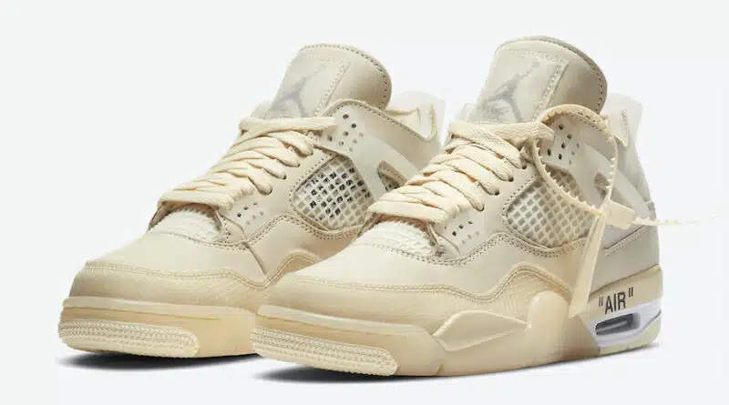 Pohodlná podrážka s jednotkou Air je v béžové a bílé barvě. Zespodu je podešev v krémové barvě, kterou doplní tvarovaný prvek s brandem v bílé barvě. Kotníkové tenisky Off-White x Air Jordan 4 SP WMNS Sail Muslin budou k dispozici u vybraných prodejců během července.