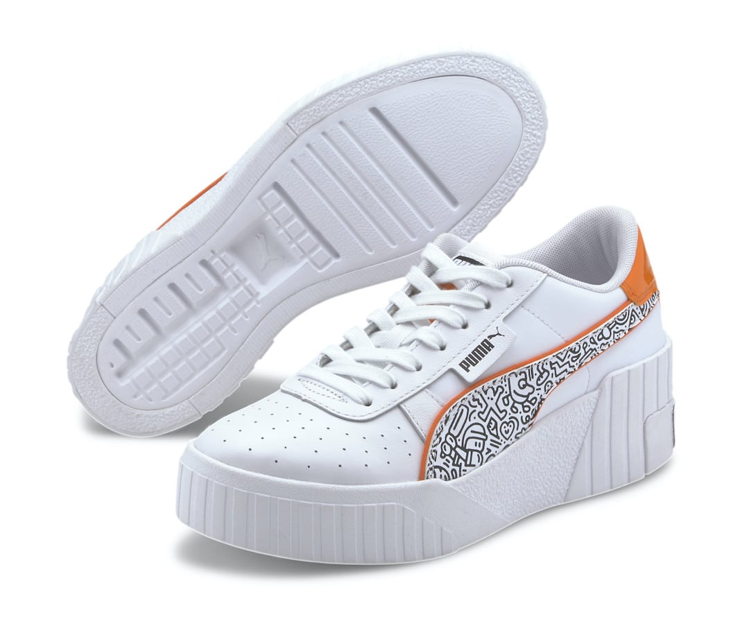 Značka Puma a Mr Doodle představili další colorway modelu Puma Cali Wedge, který je oblíbenou klasikou v moderním stylu. Kolekce nízké obuvi je v designovém tématu „Mr Doodle“, který je v barevné kombinaci bílé, černé a oranžové barvy.