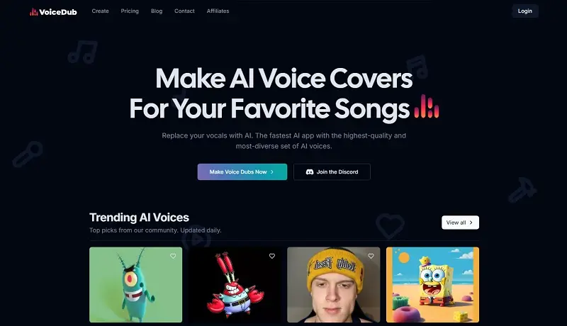 VoiceDub je špičkový nástroj s umělou inteligencí, který vám umožní bez námahy nahradit vokály ve skladbách, vytvářet hlasové covery s umělou inteligencí a generovat realistickou, vysoce kvalitní řeč. Díky rozsáhlé knihovně více než 10 000 různých hlasů umělé inteligence nabízí VoiceDub pokročilou technologii klonování hlasů a uživatelsky přívětivé rozhraní pro bezproblémové nahrávání hlasů, tvorbu coverů písní a převody textu na řeč. Ať už jste začínající hudebník nebo tvůrce obsahu, VoiceDub vám poskytne nástroje, které potřebujete k tomu, abyste své projekty během několika sekund proměnili pomocí hlasů umělé inteligence na úroveň studiové kvality.